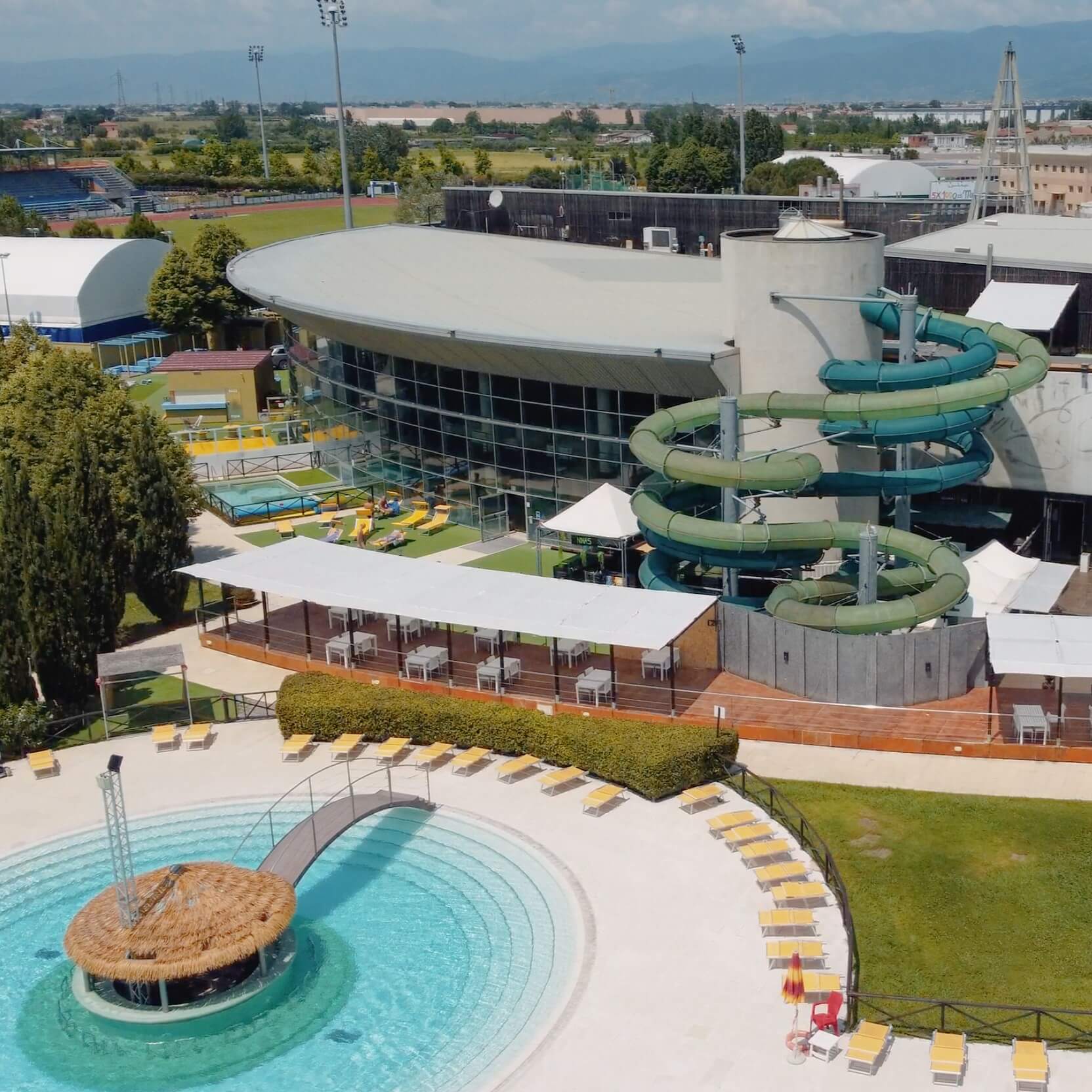 AREA ACQUA, AREA FITNESS, AREA CROSS TRAINING, AREA OUTDOOR, AREA SPA comprensivo di percorso benessere (sauna finlandese, bagno turco, idromassaggio, biosauna, mediterraneo, vasca di reazione, pioggia tropicale, nebbia fredda, doccia a secchiello), AREA BEAUTY, AREA RISTORAZIONE, PARCO ACQUATICO ESTIVO E INVERNALE.