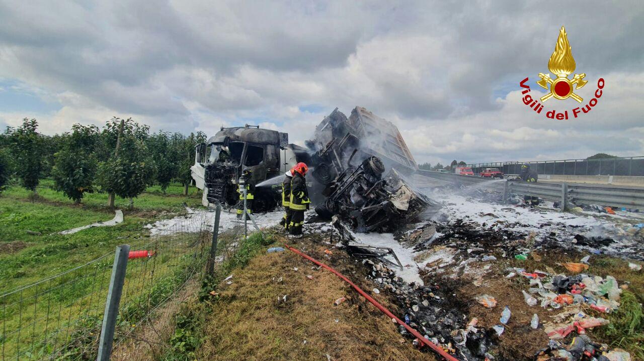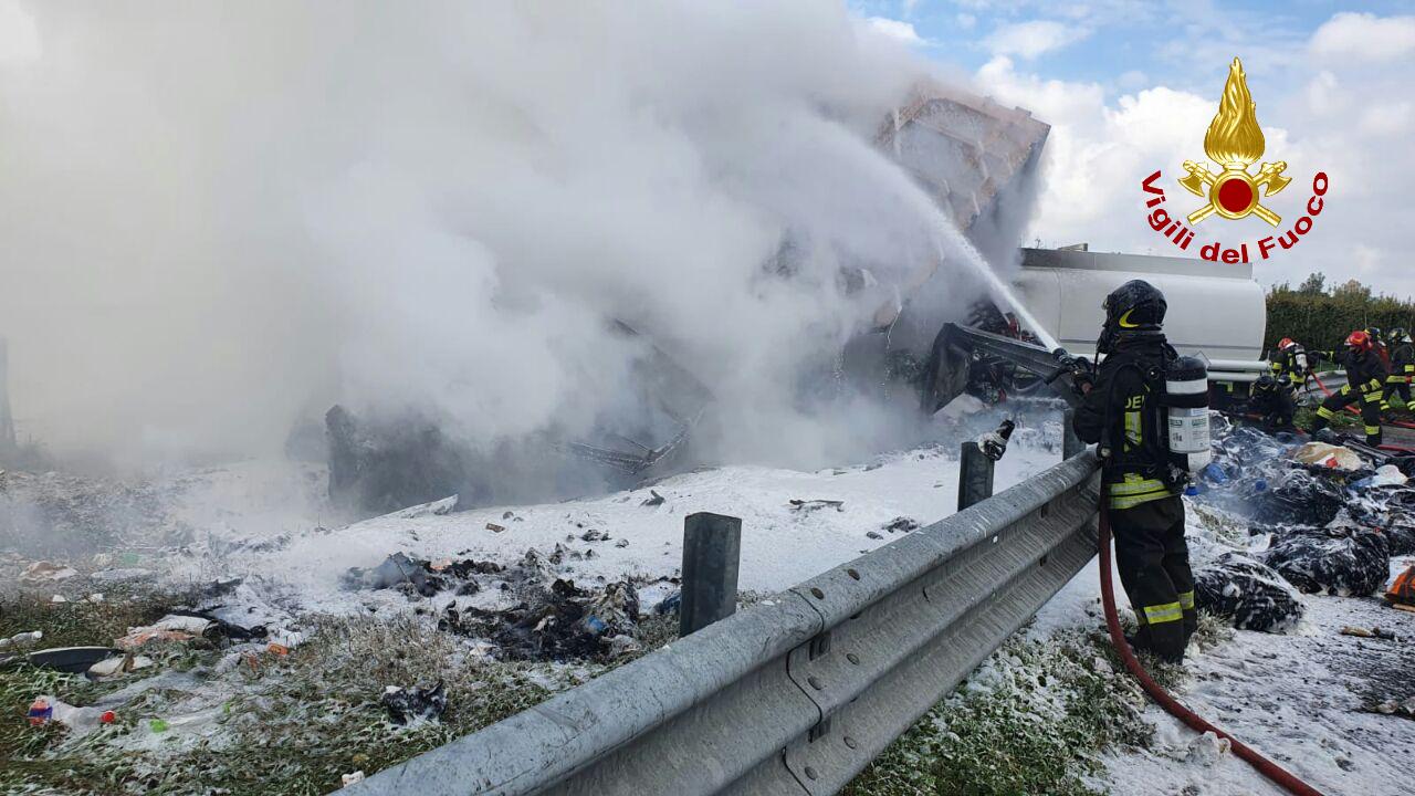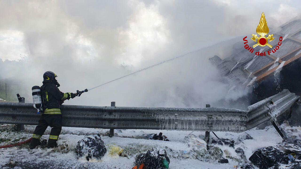 Grave incidente oggi poco prima delle 12.30 in Autostrada A1, Milano-Napoli: un tamponamento tra due mezzi pesanti si è trasformato in un vasto incendio.