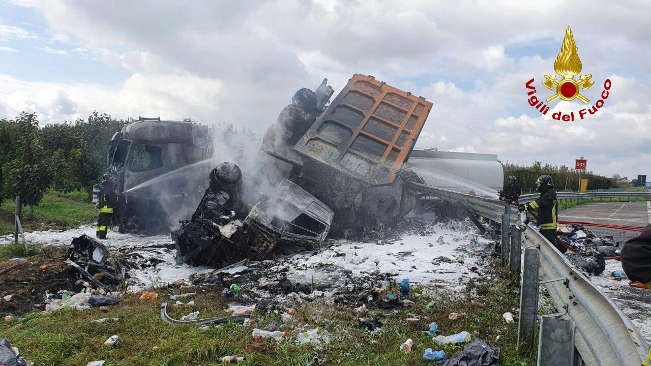 I due camion dopo la collisione sono usciti di strada. Uno dei due trasportava rifiuti mentre l’altro, un’autocisterna, benzina e gasolio. Quello dei rifiuti si è incendiato completamente, mentre fortunatamente la cisterna di benzina è rimasta integra. Sul posto sono intervenuti i Vigili del Fuoco con mezzi provenienti dal comando di Bologna, con l’appoggio di un autobotte da Modena. Presenti 4 squadre e svariate autobotti tra cui anche quella da 25mila litri. Il 115 ha provveduto allo spegnimento del rogo e alla delicata messa in sicurezza del carburante nella cisterna.