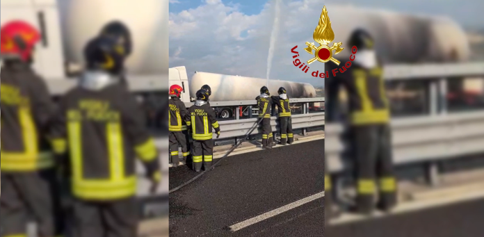 Un tratto dell’autostrada A1 chiuso in entrambi i sensi di marcia per diverse ore e automobilisti costretti a rimanere in coda sotto un sole cocente per diversi chilometri a causa dell’incendio di un’autocisterna di Gpl, provocato probabilmente da un surriscaldamento dei freni.