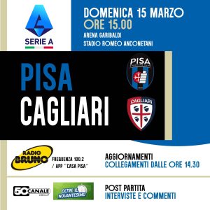 Pisa-Cagliari su Radio Bruno dalle 14:30 di domenica 15 marzo